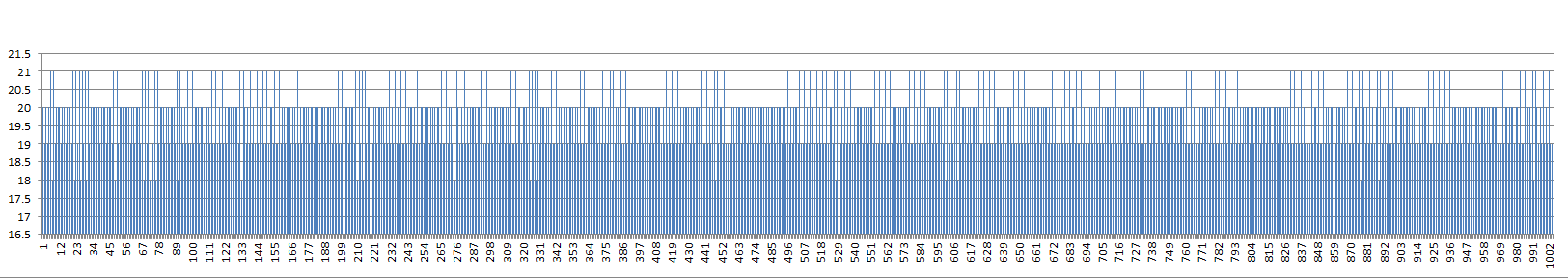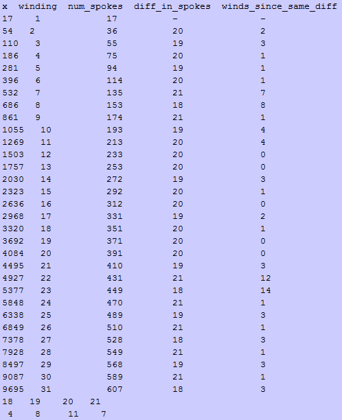 As we can see the number of additional spokes is either 18, 19, 20, 21 with 20 being the most and 18 being relatively rare. Going further to, for example, the first 100,655 windings the additional number of spokes is 18, 179 times, 19, 3612 times, 20, 4928 times and 21, 3612 times.